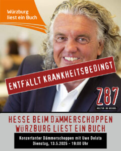 Krankheitsbedingt muss die für Dienstag, 13. Mai angedachte Lesung mit Musik Hesse beim Dämmerschoppen im Rahmen der stadtweiten Aktion Würzburg liest ein Buch leider abgesagt werden.