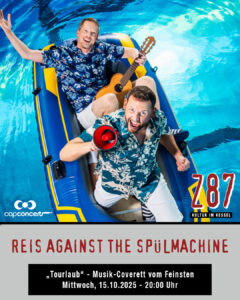 “Ab in den TOURLAUB!” ist das Motto der neuen Bühnenshow von REIS AGAINST THE SPÜLMACHINE. Im vierten Konzertprogramm des Musik-Comedy-Duos dreht sich alles um das Thema Urlaub. “Wir haben eine Urlaubs-Playlist im Gepäck, mit der wir unser Publikum zu einem zweistündigen Kurzurlaub einladen wollen”, erklärt Hanke Blendermann das Konzept.