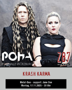 KRASHKARMA ist weit mehr als nur eine Metal-Band – sie sind eine Naturgewalt. Mit über 6 Millionen YouTube-Views, 213.000 Facebook Followern und mehr als 700 Shows weltweit hat sich das Ausnahme-Duo aus Los Angeles einen festen Platz in der Szene erobert. Im Zentrum steht die charismatische Niki Skistimas, die als Schlagzeugerin, Sängerin mit explosiven Beats und energiegeladenen Vocals die Bühne