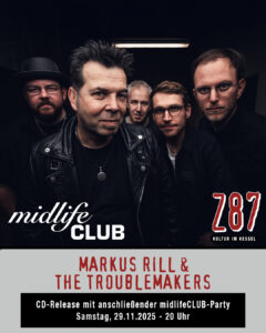 Songs, die Seele, Herz und Verstand berühren. Mitreißender Rock’n’Roll, emotionaler Soul, atmosphärische Americana-Sounds: Das ist die Musik von Markus Rill & The Troublemakers. Wo immer der Songwriter und seine erstklassige Band auftreten, schwärmen die Zuschauer von ihrer mitreißenden Performance, ihrer Vielseitigkeit und Authentizität.