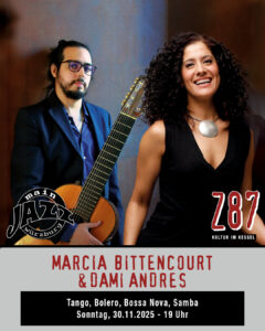 Seit dem Jahr 2019 bündeln sich die musikalischen Potentiale der brasilianischen Sängerin Marcia Bittencourt und dem aus Buenos Aires stammenden Gitarristen Dami Andres in einem kongenialen Duo. Sie vereinen seitdem Klassiker des Tango, Bolero, Bossa Nova, Samba + eigene Kompositionen. Marcias faszinierende Ausdruckskraft -von den leisesten Tönen an bis zur vollen Entfaltung ihres breiten stimmlichen Spektrums- und die Brillanz des Virtuosen Dami Andres auf der achtsaitigen (!) Gitarre sorgen immer für einen unvergesslichen Abend. So springt die Kraft, das Temperament und die musikalische Energie Südamerikas auf das Publikum über, denn sie sind unglaublich lateinamerikanisch – incrivelmente latino!