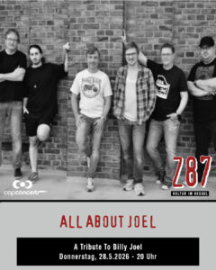 Tauchen Sie ein in die musikalische Welt eines der größten Singer-Songwriter unserer Zeit – Billy Joel! Mit „All About Joel“ erleben Sie nicht nur eine Tribute-Band, sondern eine leidenschaftliche Hommage an das immense Schaffen dieses Ausnahmekünstlers. Seit 2021 hat sich All About Joel aus bescheidenen Anfängen im kleinen Proberaum zu einer kraftvollen 6-köpfigen Formation entwickelt, die das Beste aus Billy Joels beeindruckendem Repertoire auf die Bühne bringt.