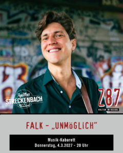 „Unmöglich!“ heißt das neue Konzertprogramm von FALK. Mit gewohnt liebevollem Pöbeln amüsiert sich der satirische Songdichter gemeinsam mit seinem Publikum über die Absonderlichkeiten des Alltags – bissig, mit scharfer Beobachtungsgabe
